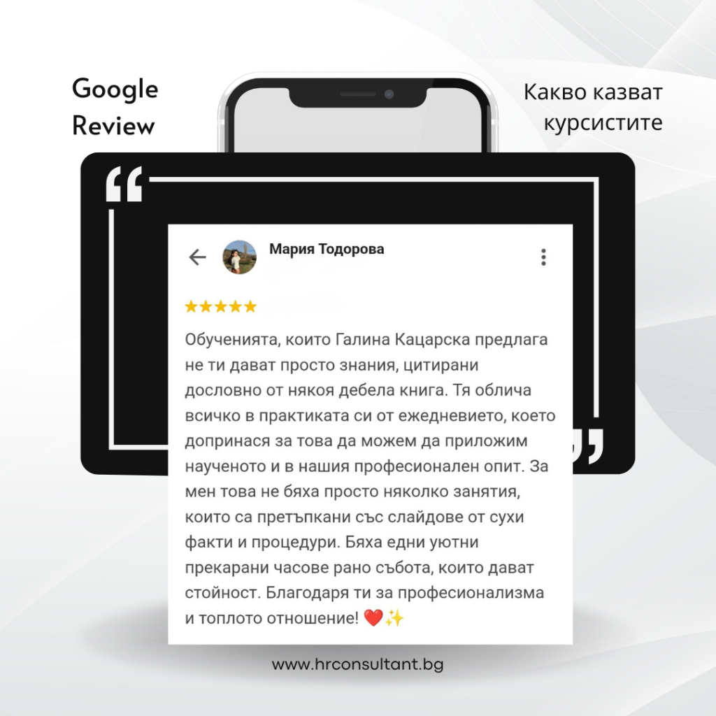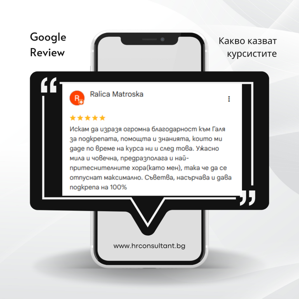 ВАЖНО: Заяви участието си в обучението по “Подбор на персонал”, попълвайки формата по-долу или като се свържеш с нас на e-mail: galinakatsarska@gmail.com.